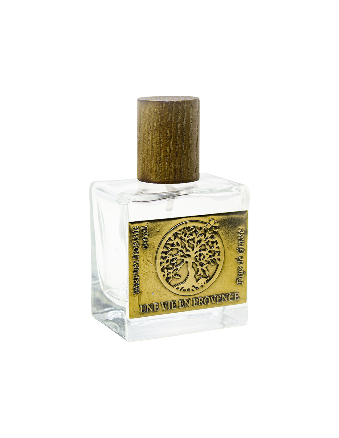 Flacon verre 50ml avec étiquette étain naturel et bouchon bois + vaporisateur